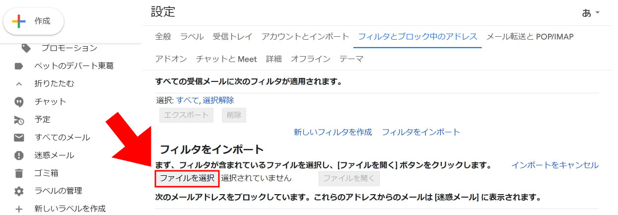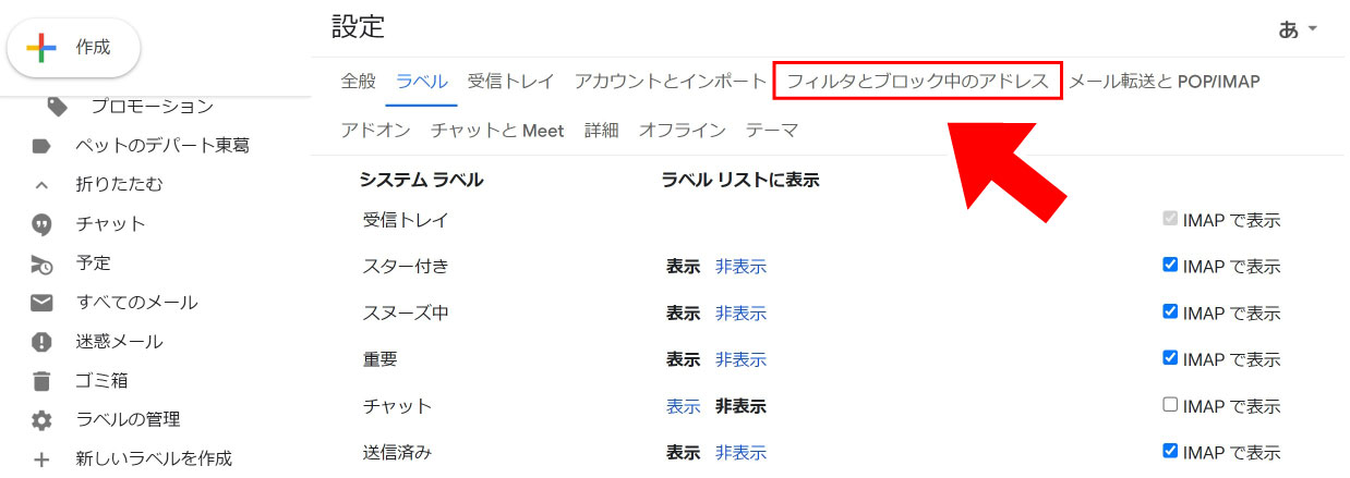 ③ ラベルの管理画面が開いたら、【フィルタとブロック中のアドレス】を選択してください