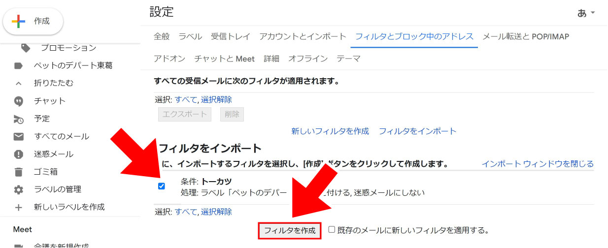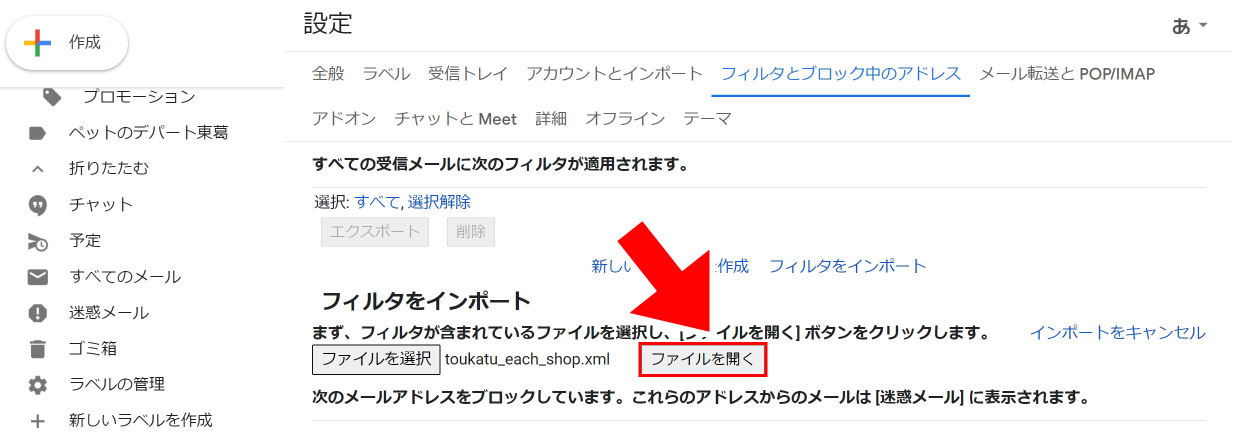 ④ 次に、【フィルタをインポート】を選択します