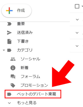 設定のインポートが成功すると、下図のような「ペットのデパート東葛」のラベルができあがります。サイト経由のメールは全てここでご確認いただけるようになります。