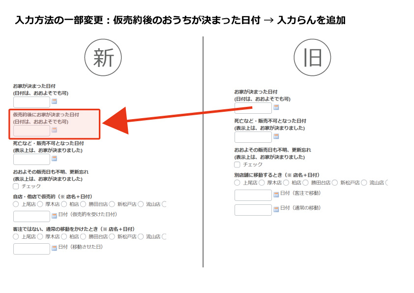 仮売約後におうちが決まった場合、新たに設けた入力らんへ日付を入力します。