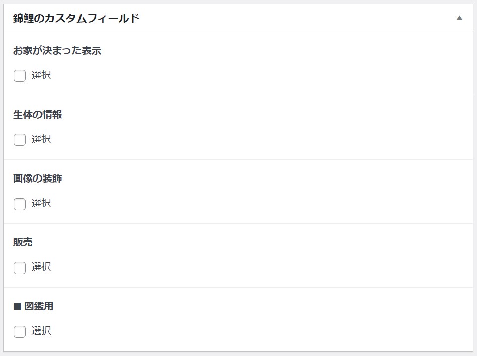 例えば、錦鯉のカテゴリーを選ぶと、下のような錦鯉用のカスタムフィールドが現れます。