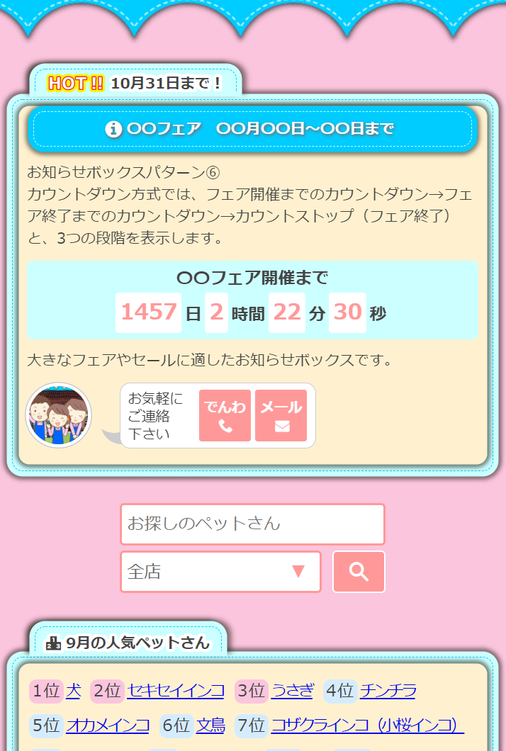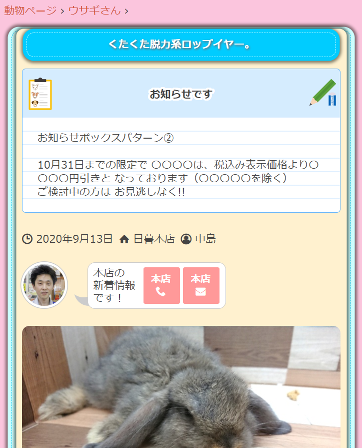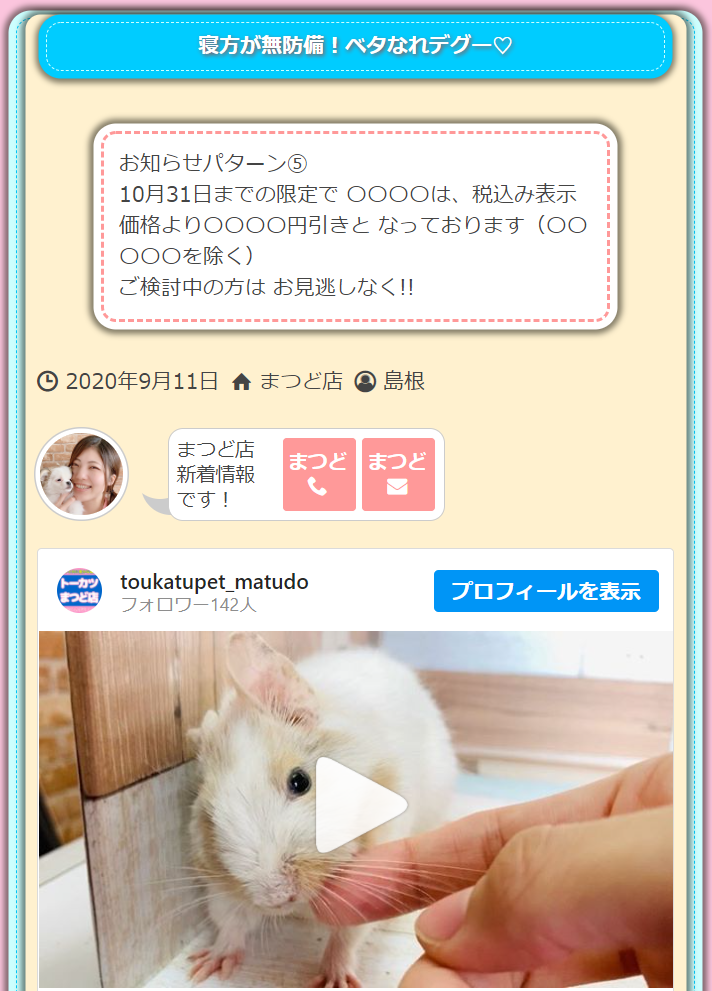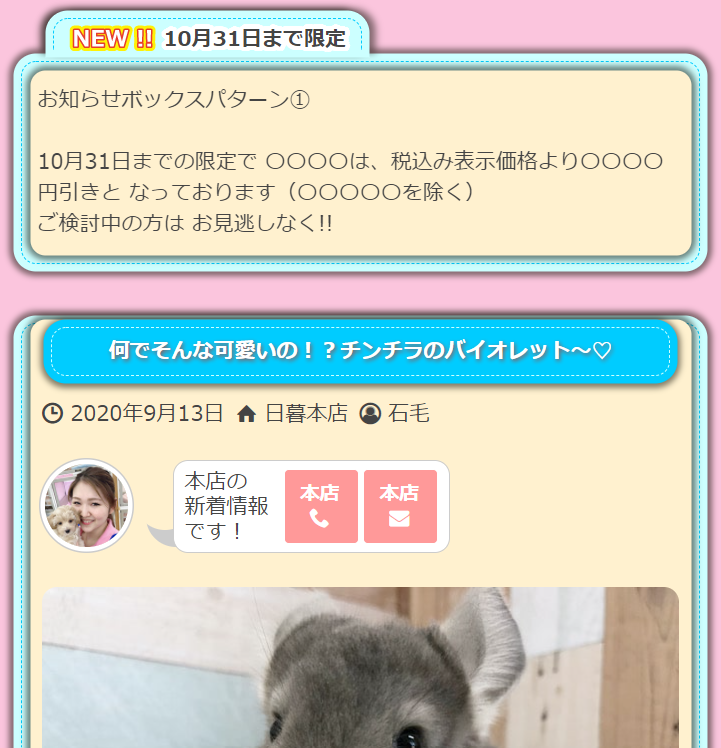 たとえば、全てのチンチラの記事にフェアの告知を挿入したり、フェアを行う店舗のチンチラだけに告知を入れるといったこともできます。