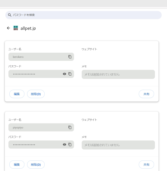 パスワードマネージャーを開いて行います。自分以外のIDやパスワードを誤って編集することがないよう気を付けて行ってください。
