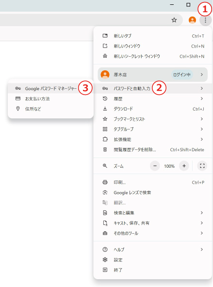 まず、クロームを開き、右上アカウントのアイコン横の3点メニューから番号順にクリックします