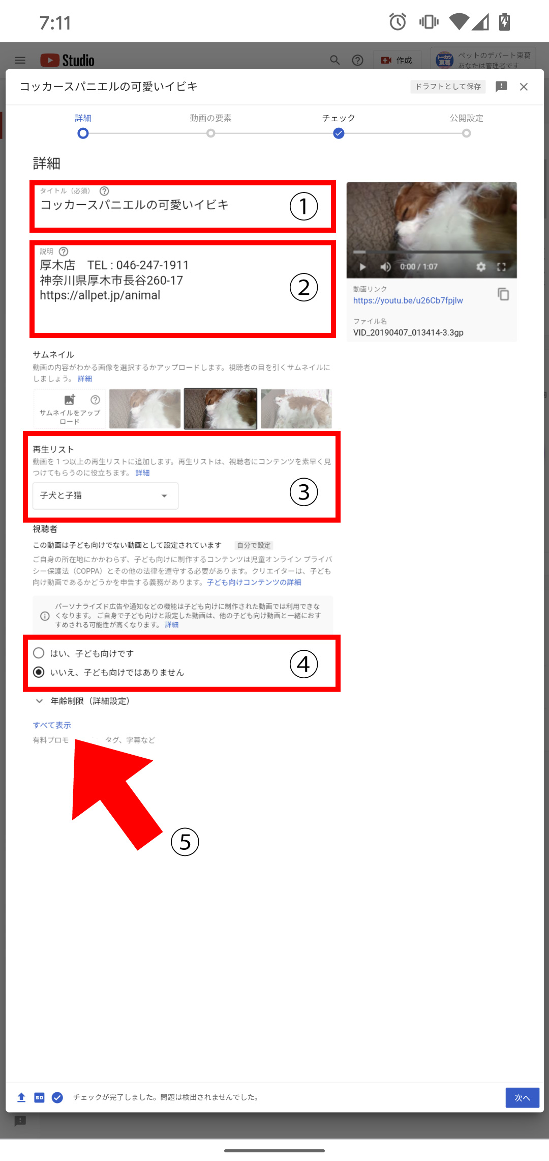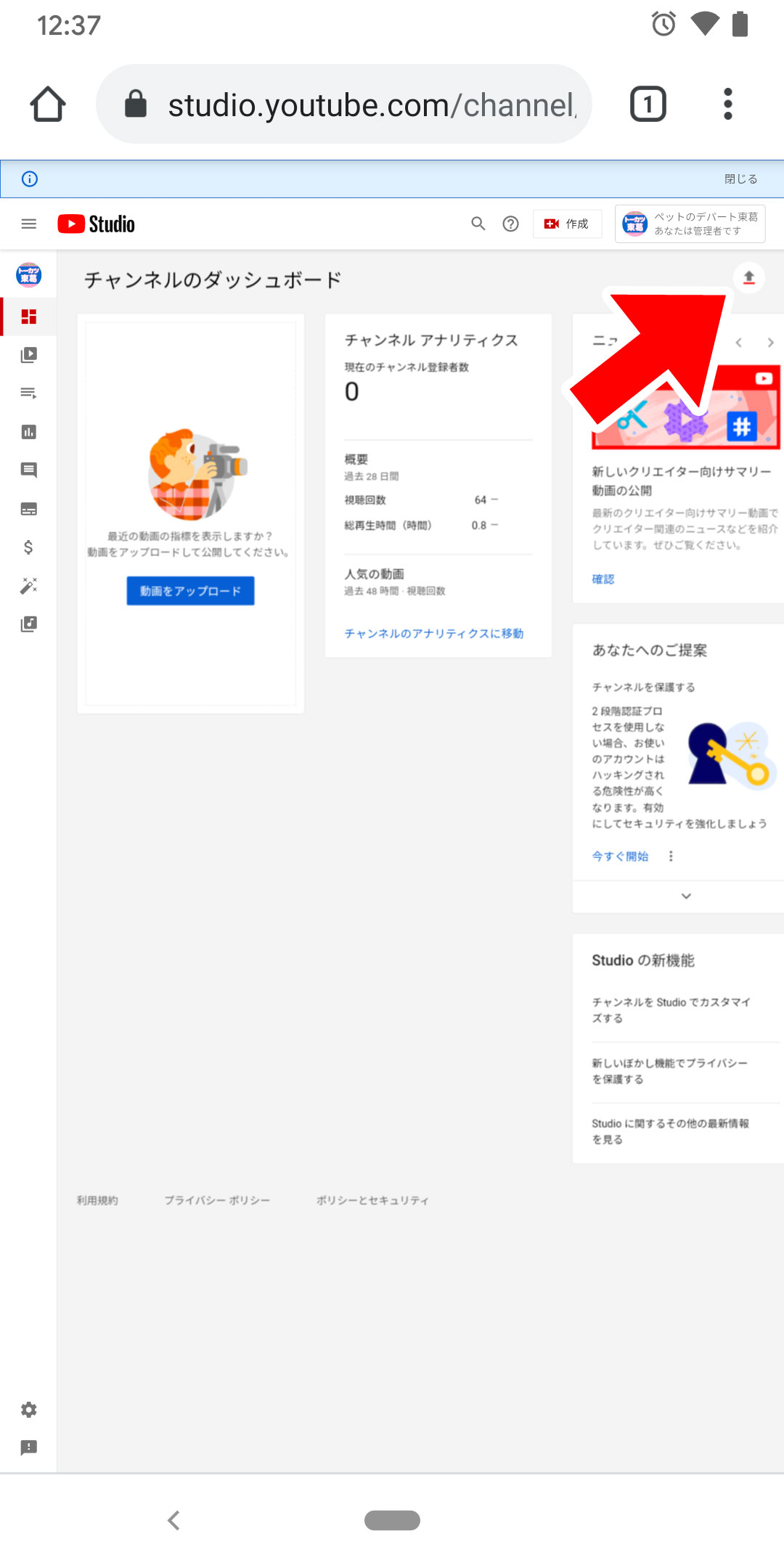 アカウントが【ペットのデパート東葛】になっているか確認し、矢印マークが指すアップロードボタンをクリックします