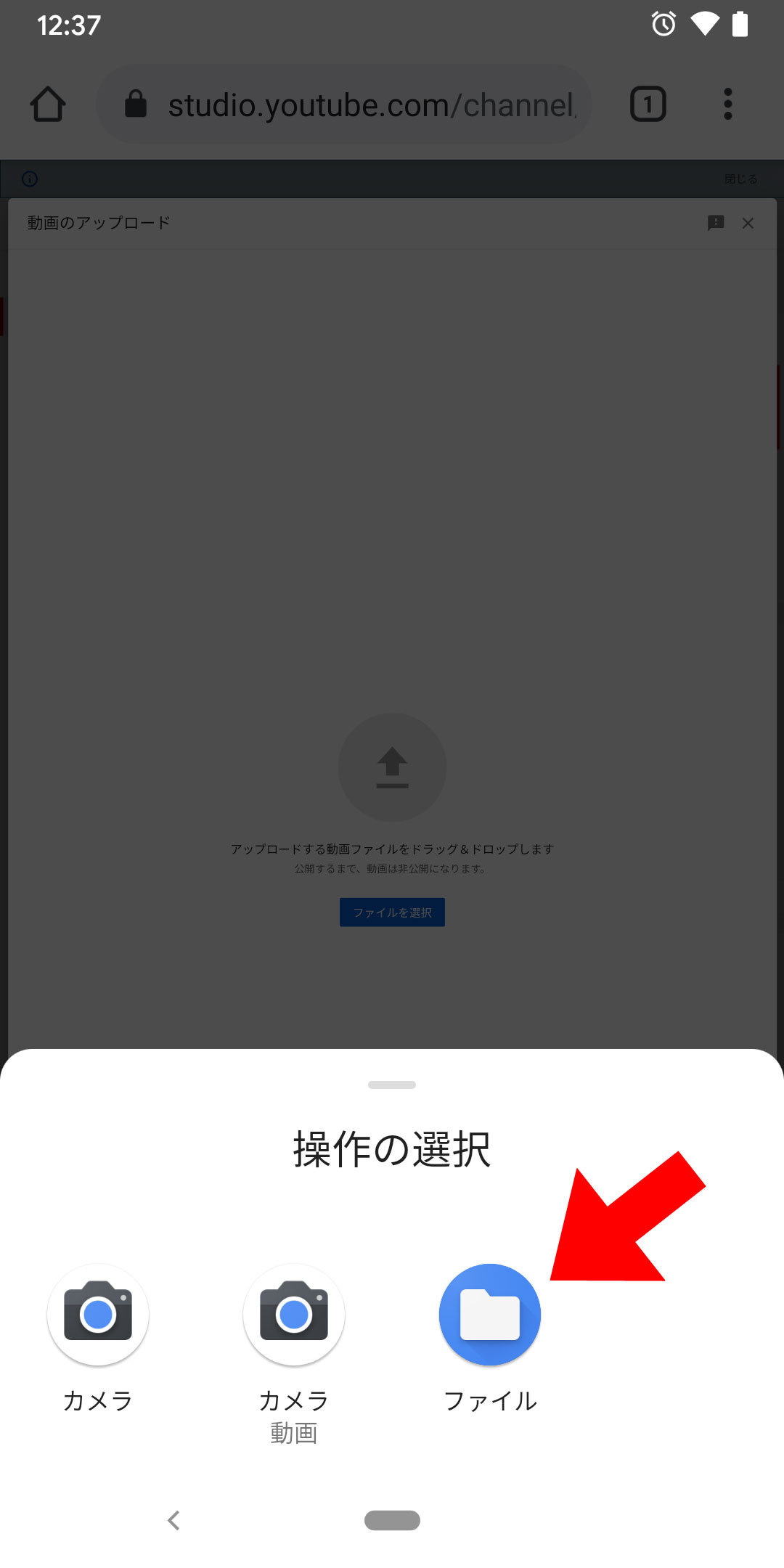 選択画面では、別のアイコンが出ることもあります。すでに撮影した動画をアップするには、【ファイル】や【ドキュメント】など、それに近い単語を選択して動画を探します